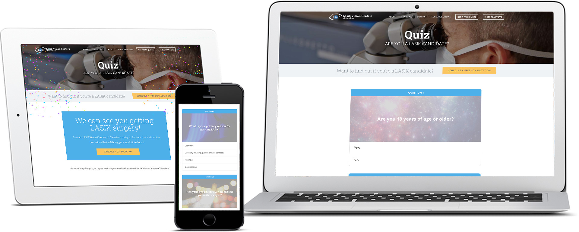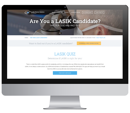 The work started with the technical task of creating the LVC “Eye Detector” quiz. The team at LVC came up with a few very specific questions that are used to assess whether or not someone should even pursue the idea of having LASIK done. There are some immediate deal-breakers that can eliminate many people who are thinking about having the procedure. The quiz itself was easy to follow, simple, and just a few questions long. At the end, the quiz taker was given a “Thank You” message that confirmed that their quiz submission was entered and told them to be ready for a gift card to be mailed out to them. The quiz “lived” on the LVC website, so when people clicked on the social media ads for the quiz, they were taken to the website to complete the form.